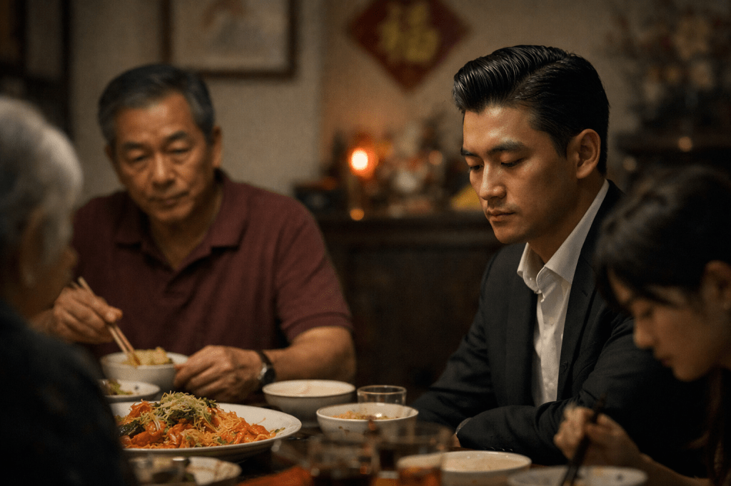 The rest of the family paused briefly between mouthfuls of yusheng and noodles. His sister kept her head down. Her eyes became part of her bowl.