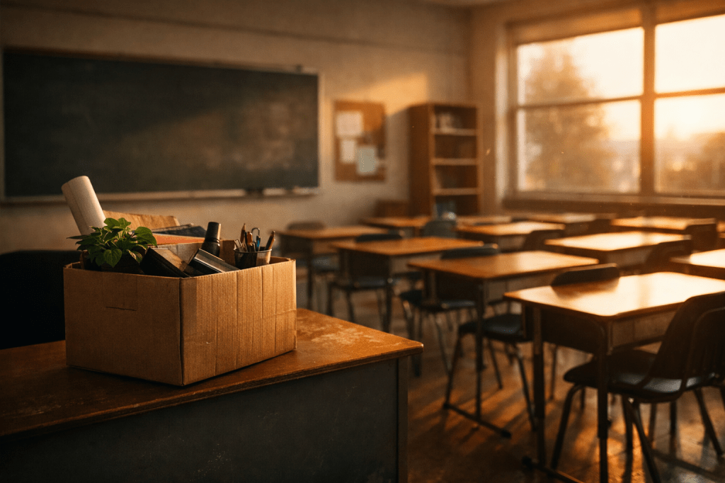 The cardboard box. The desk, cleared.
